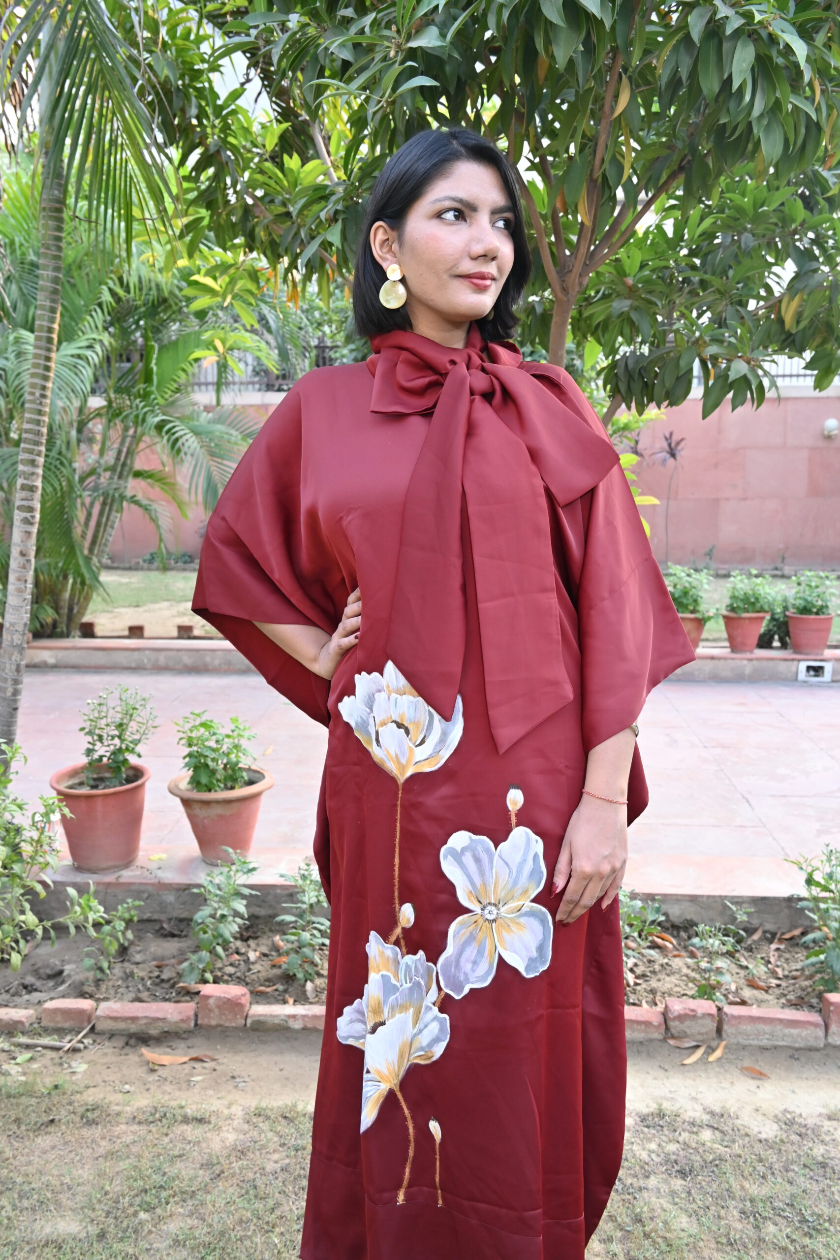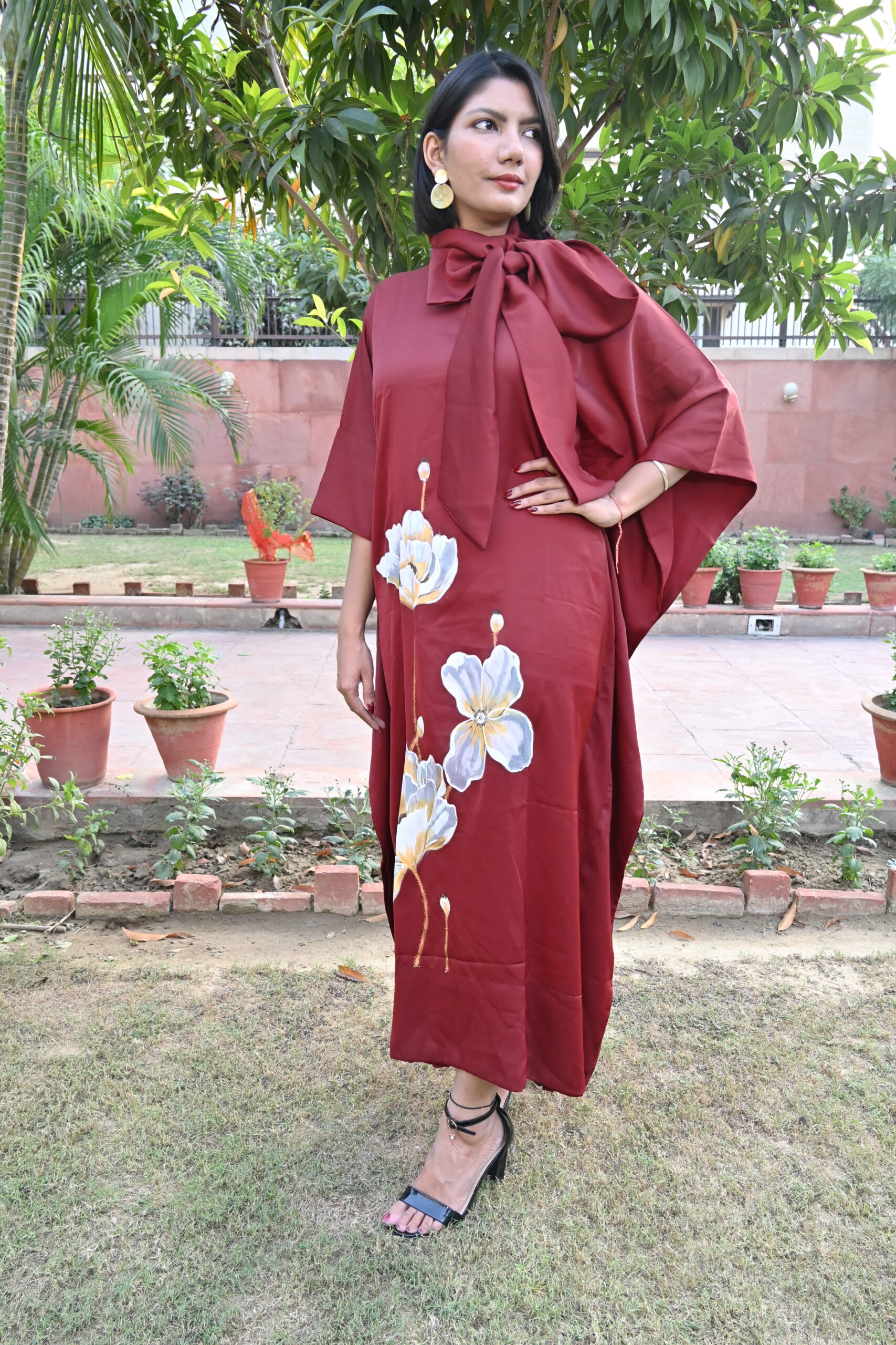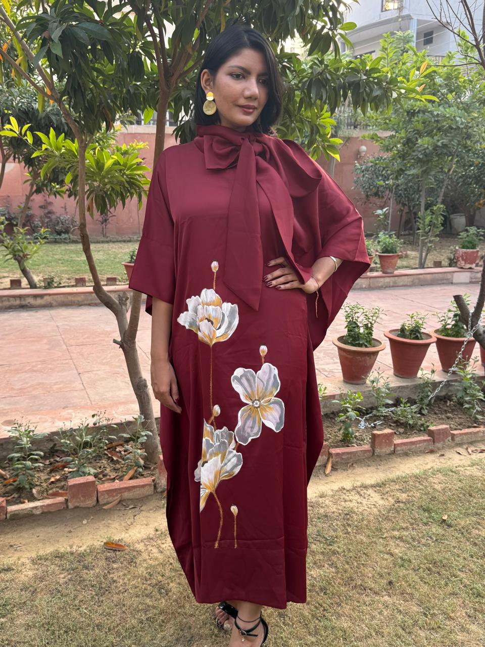 It’s a wine colour long dress,with a bow on the side of the neck.Has a white n grey colour bunch of big flowers painted at the front.
