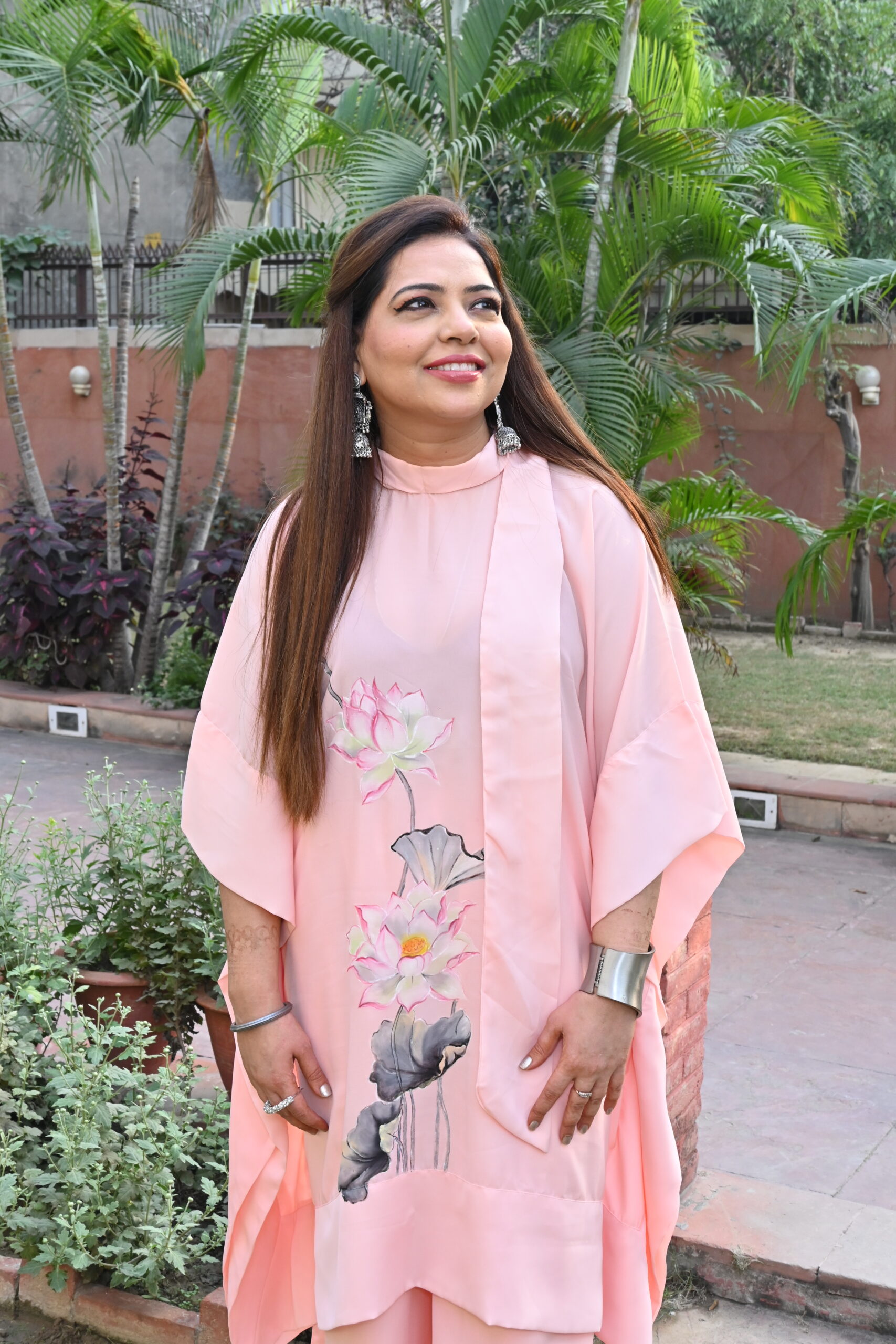 Double shade ,Hot pink n orange shirt style center button placket cord set with butterfly shaped ,blue coloured ladies abstract faces painted at the middle centre of the shirt .It’s paired with the double shaded pants