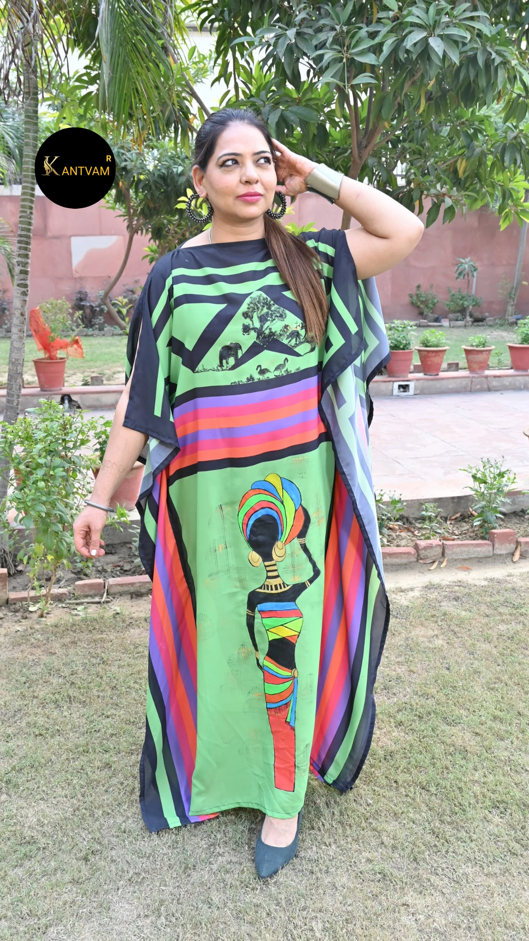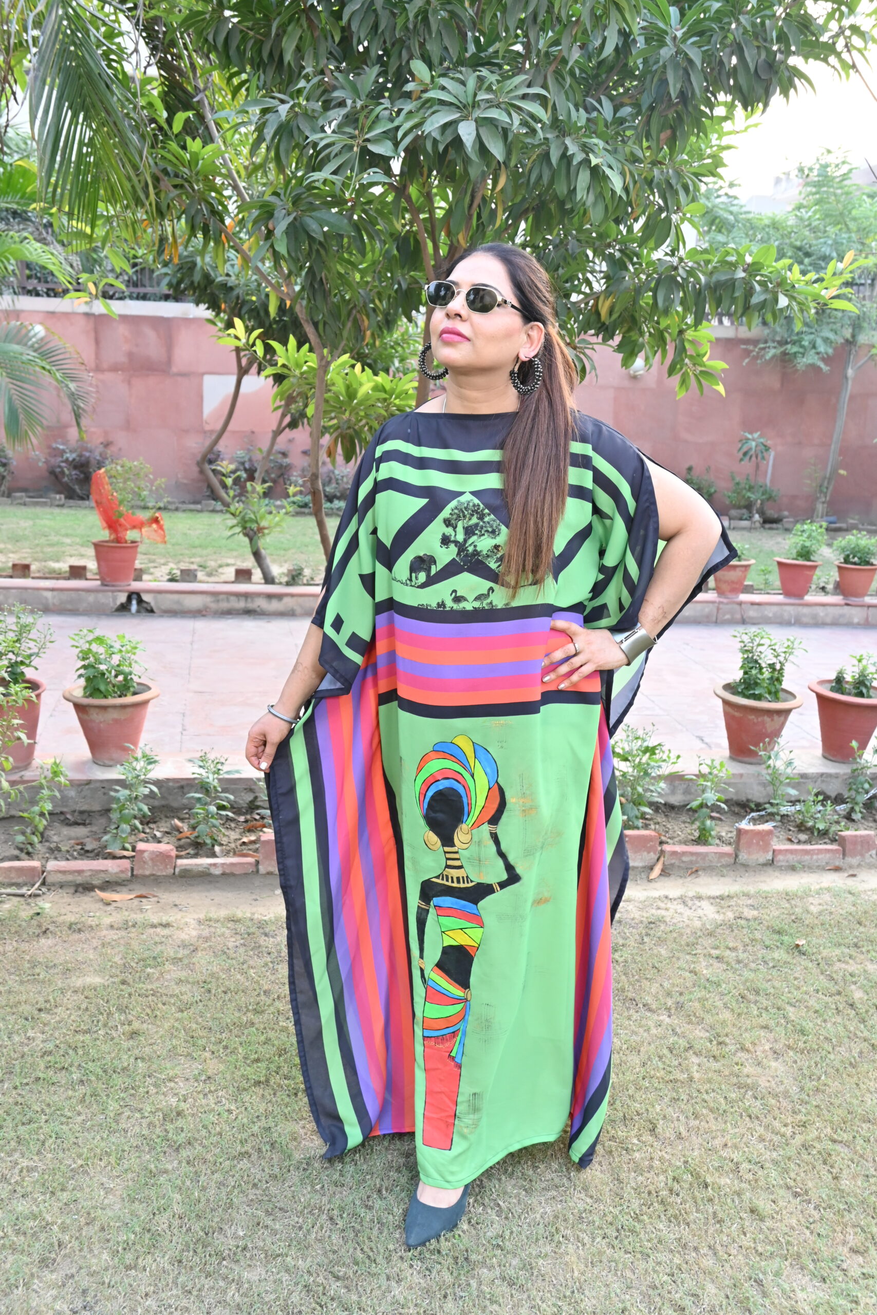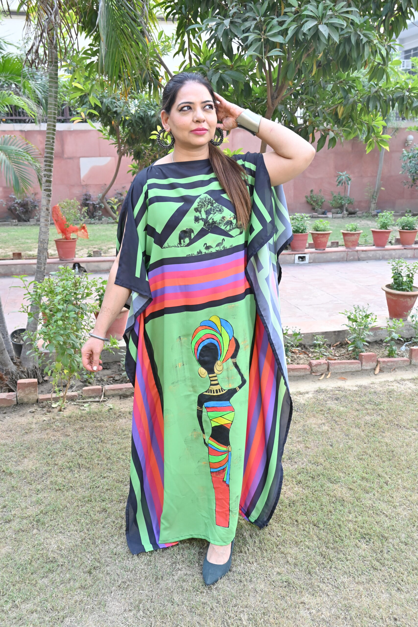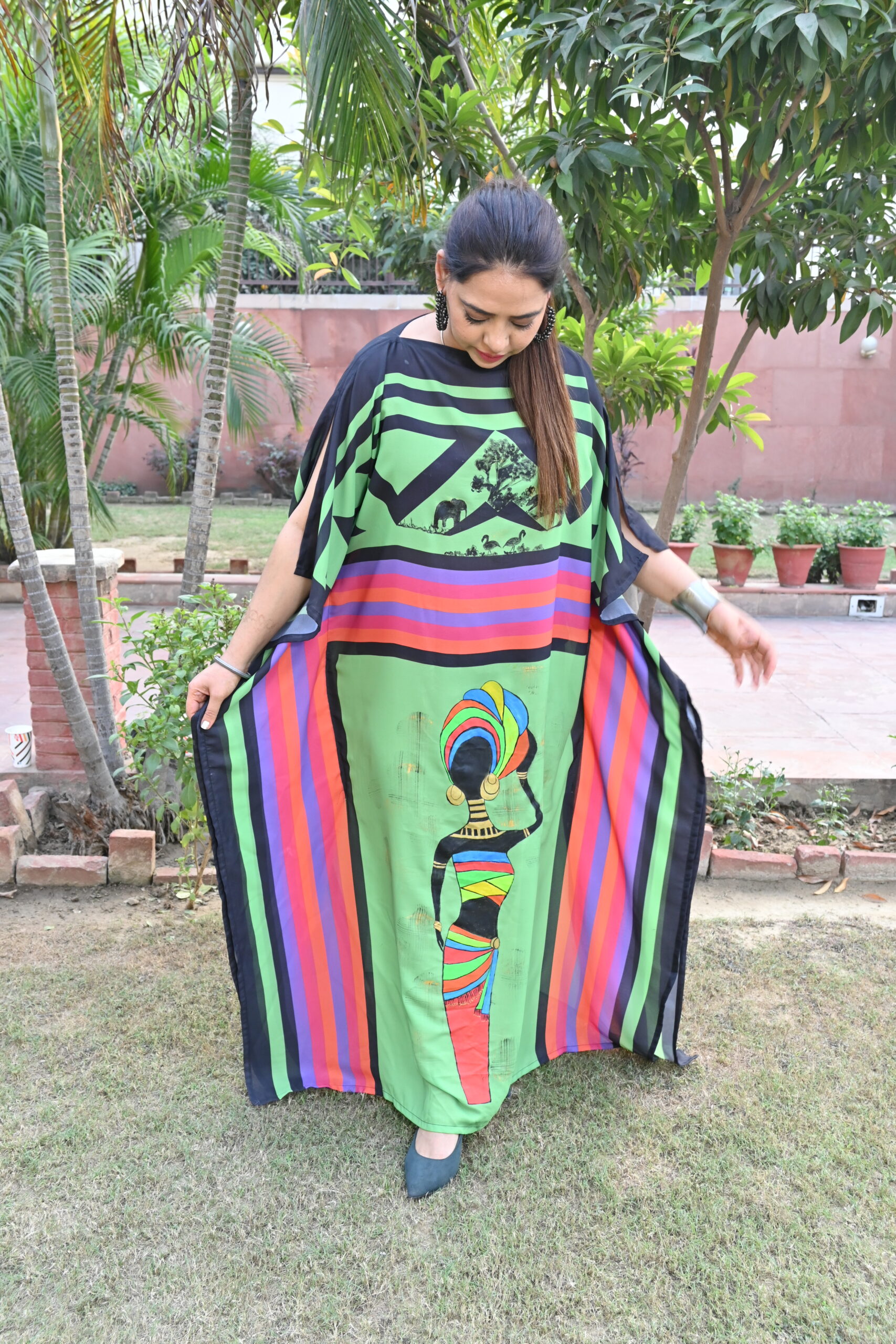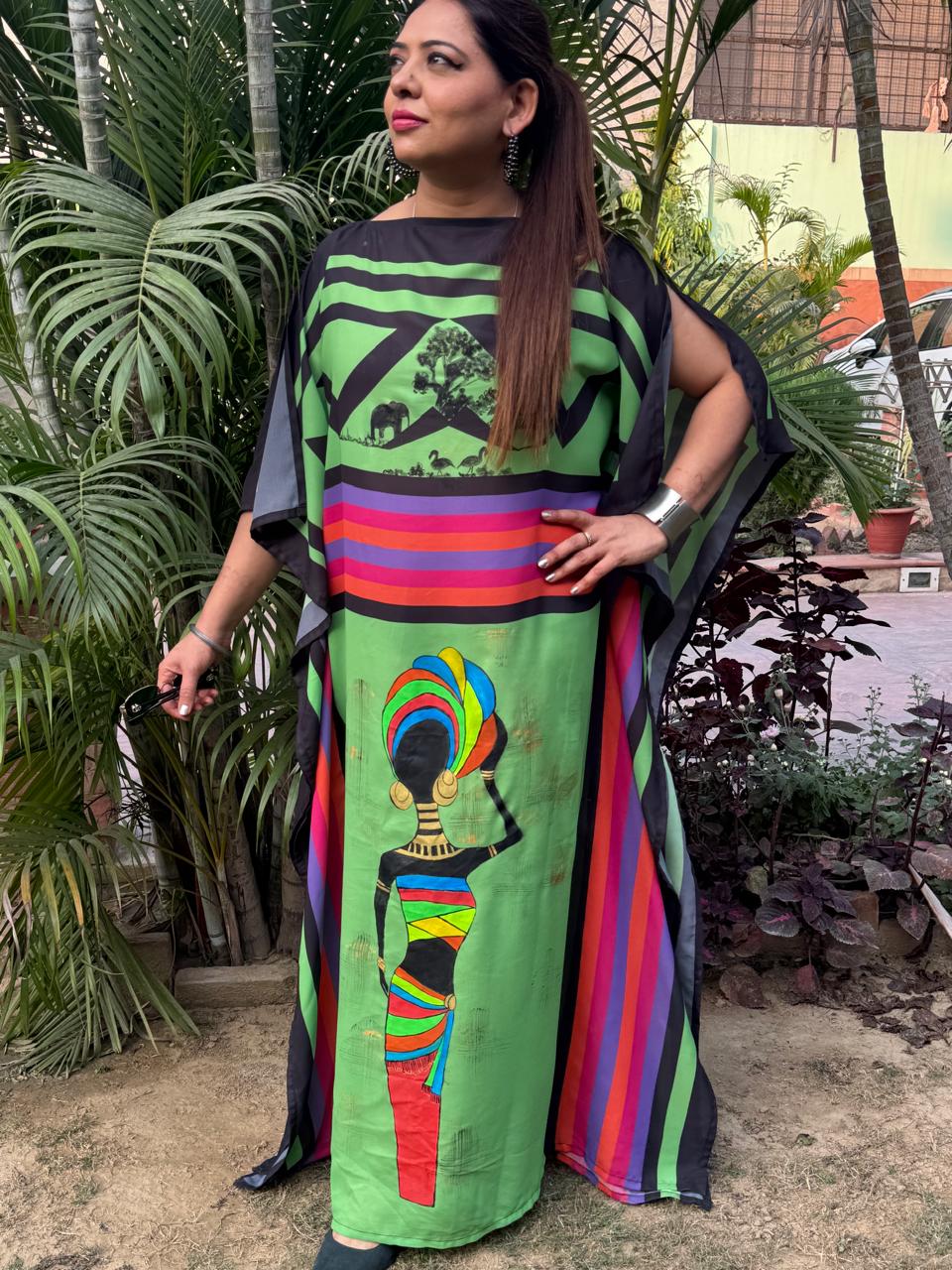 Green printed kaftan with hand-painted African art on it.Elephants n an African lady painted.